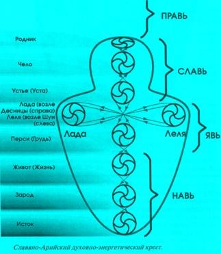 [19] Навь тёмная- чистилище (пекло)-место пребывания не развитых душ грешников. Явь - материальный мир. Навь Светлая - мир тонкоматериальных тел: астральных (лептонных матриц), ментальных (тел ума) и буддхических (тел интеллекта). Туда уходят после смерти органического тела люди, не сумевшие в полной мере взрастить свою душу - деваконическое (Дивное тело) и перенести в это тело своё сознание. Славь - это мир полубогов и дваждырождённых (в теле и в духе) предков, живущих в Дивных (деваконических) телах. Правь - это мир Богов и Предков сумевших достичь совершенства, т.е. создавших себе Светоносные (саттвические) тела - полевую форму жизни, неподверженную влиянию пространства и времени. В мире Яви Светоносные (саттвические) тела наших Богов и Предков проявляются в виде Звёзд, на орбите которых находится до 7 Земель (планет) или Солнц, на орбите которых находится более 7 Земель (планет).